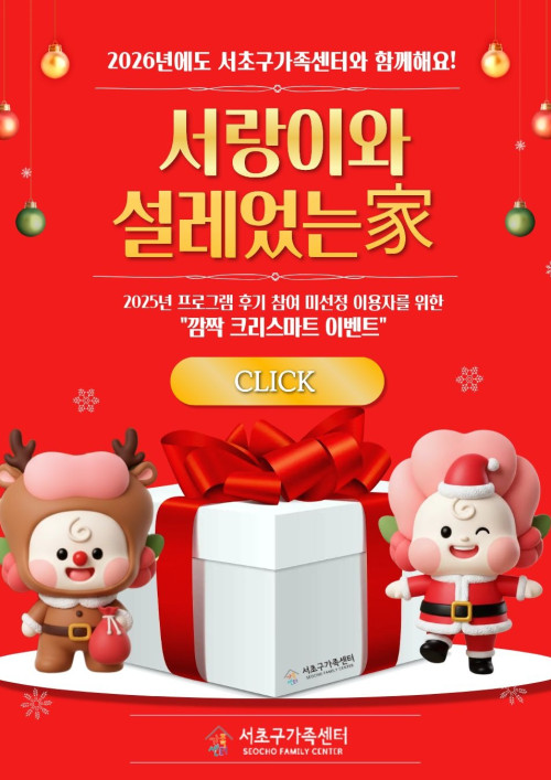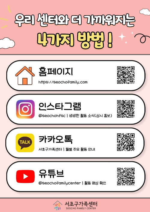『서초구가족센터는 이메일무단수집을 거부합니다. 서초구가족센터 웹사이트에 등록된 이메일 주소가 전자우편수집 프로그램이나 그 밖의 수단들로 무단 수집되는 것을 거부합니다. 이를 위반 시 정보보호 등에 관한 법률 제50조의 2와 65조의 2에 따라 형사처벌 됨을 유의하시기 바랍니다.』