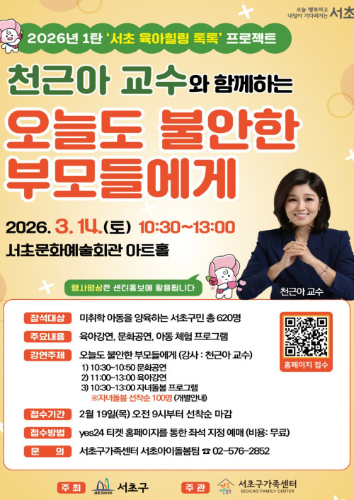 [서초아이돌봄팀] 천근아교수와 함께하는 서초 육아힐링 톡톡, “오늘도 불안한 부모들에게!” 참여모집 안내
