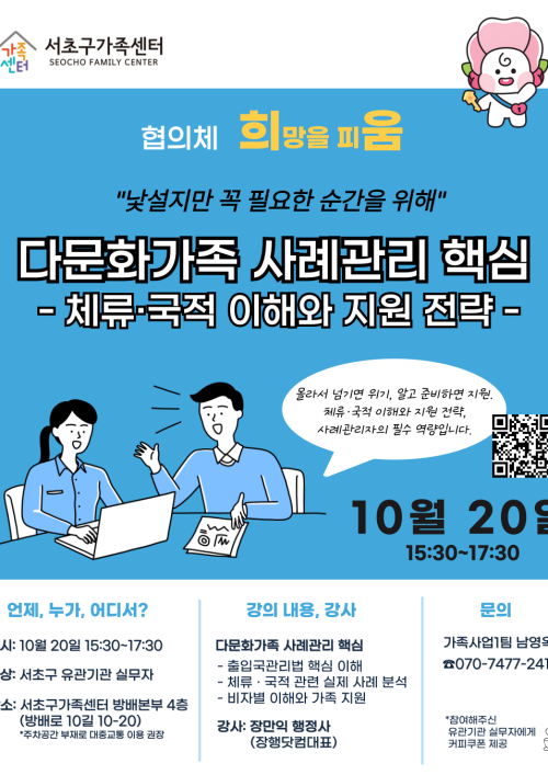 『서초구가족센터는 이메일무단수집을 거부합니다. 서초구가족센터 웹사이트에 등록된 이메일 주소가 전자우편수집 프로그램이나 그 밖의 수단들로 무단 수집되는 것을 거부합니다. 이를 위반 시 정보보호 등에 관한 법률 제50조의 2와 65조의 2에 따라 형사처벌 됨을 유의하시기 바랍니다.』